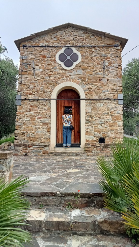 La salita al paese è agevole. Si passa il piccolo santuario di Madonna della Neve (toponimo comune in queste valli) che ci regala un microscopico angolo di paradiso: una chiesetta minuscola si affaccia su un pianoro coltivato ad ulivi, ombreggiato e tranquillissimo… Idilliaco.