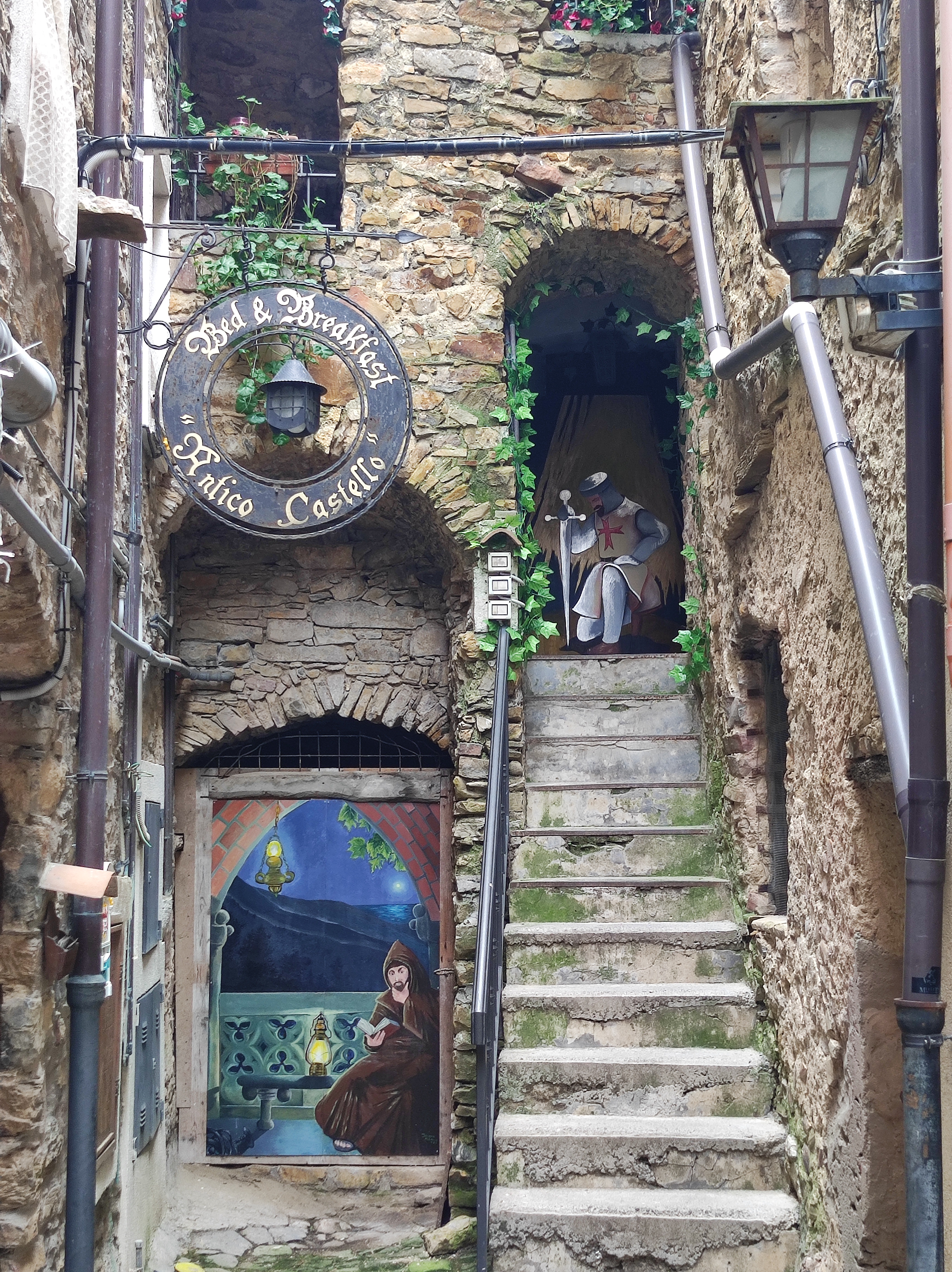 Dopo aver sostato qualche minuto sul sedili in pietra della piazza ed aver visitato la piccola chiesetta (che reca in facciata l’immagine di Cristo NON al centro ma a destra) abbiamo imboccato a scendere Via Verdi, un basso passaggio archivoltato, che altro non è che una vecchia porta medievale di accesso al paese e ci siamo ritrovati in una ulteriore piazza la quale è sede del Comune di Seborga e dei suoi uffici pubblici. Tale piazza prosegue in una via che percorre l’antico tracciato che percorreva la base delle mura di fortificazione del paese. Vi accorgerete di questo per due motivi: il primo è che gira attorno a tutto il paese; il secondo è che vi accorgerete che gli edifici, visti dal basso hanno una altezza “sospetta”.