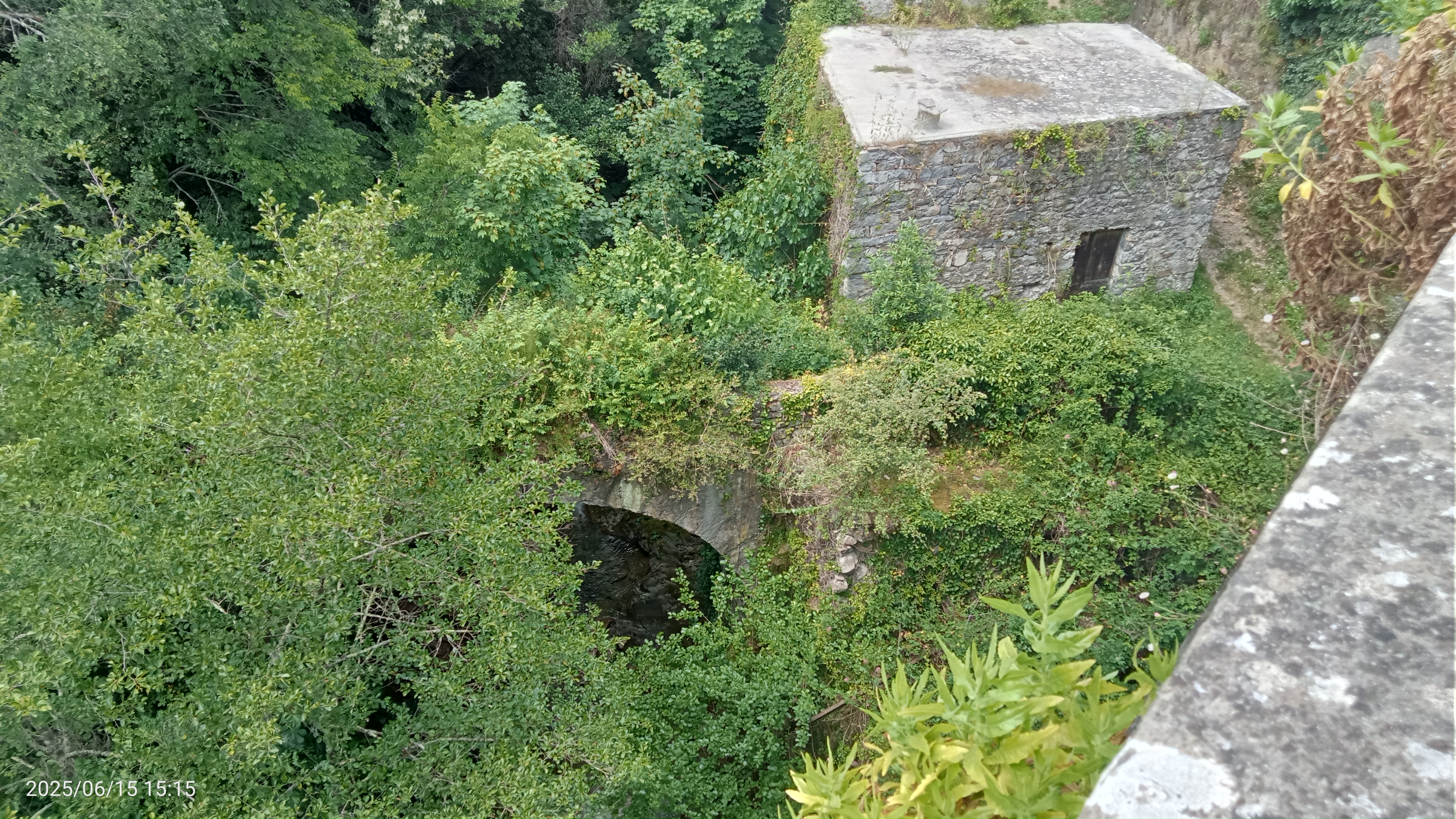 Un altro segno di questo mondo oramai perduto è nascosto dalla vegetazione infestante: un ponte largo poco più di un metro (probabilmente simile a quello che vedremo tra poco) collegava il mulino alla parete di roccia dirimpetto. Se ne percepiscono l’orientamento e le spallette… Allo stato attuale non riusciamo a capire se fosse un ponte pedonale o dedicato al trasporto delle acque, ma la sua esistenza attira tutta la nostra curiosità.