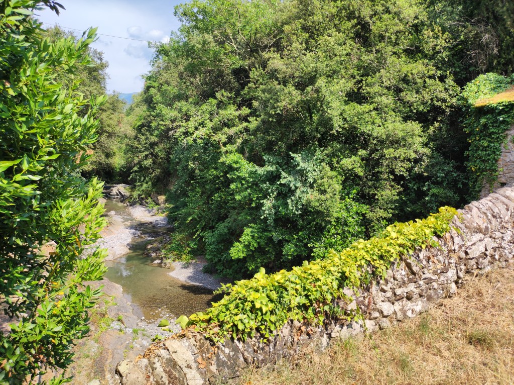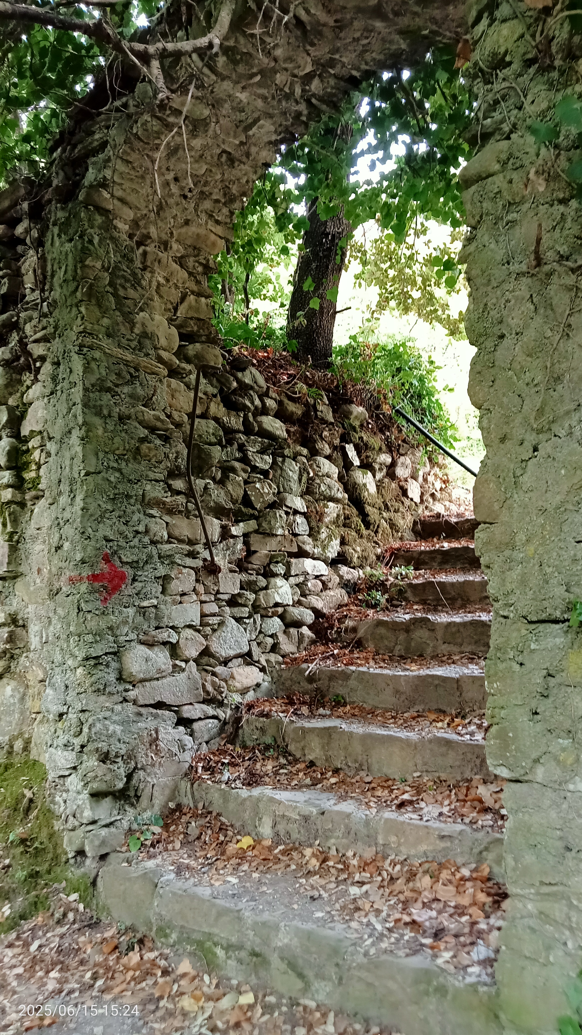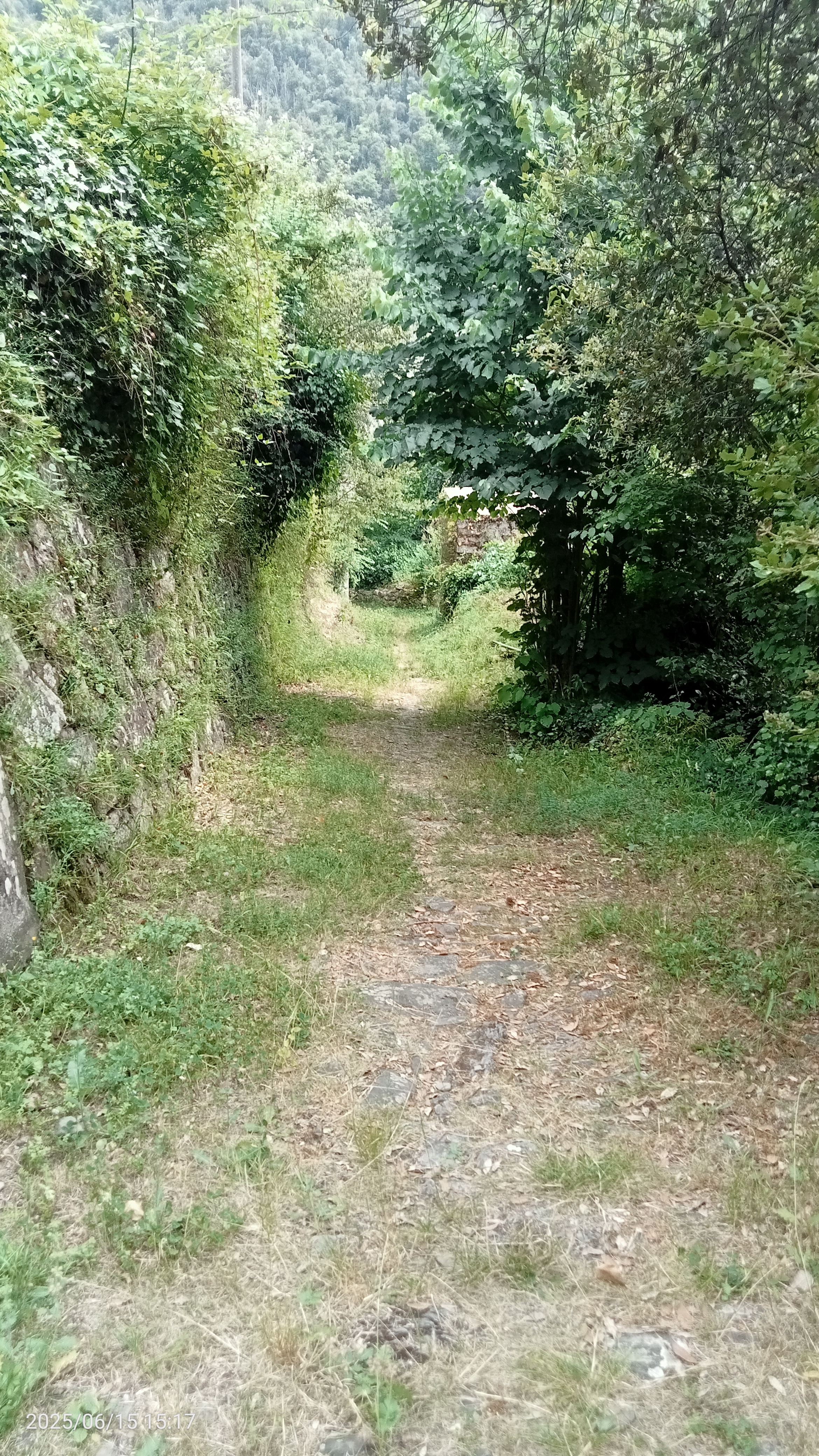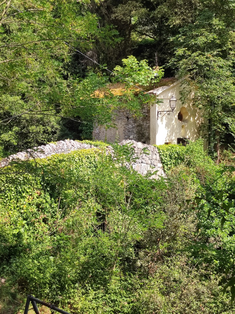 Inizia così una piacevole passeggiata al coperto delle fronde di castagni, lecci, cipressi, edere che a sinistra ci regala viste sul letto del torrente ed a destra è protetta da un muraglione di pietra. Dopo un centinaio di metri, nel muraglione si apre un portale.