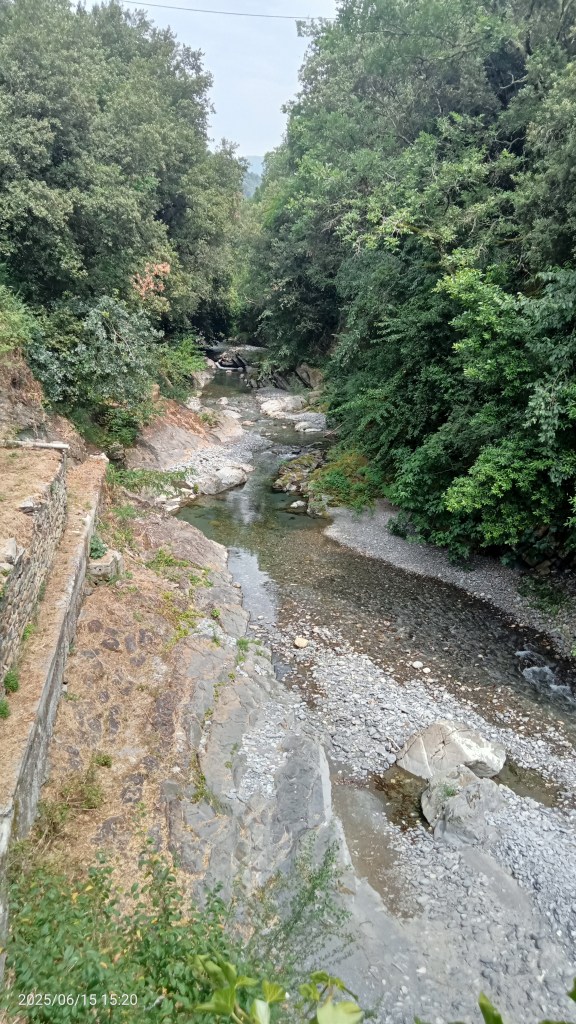 Proseguiamo placidamente la passeggiata, con un senso di rilassata villeggiatura. La strada poi si restringe abbassandosi un po’ di quota. Le fasce si fanno più vicine ed il paese, dalla parte opposta del fiume, si rende più delineato e visibile. Segno che stiamo per terminare il percorso, lasciando la parte più selvatica ed avventurosa.