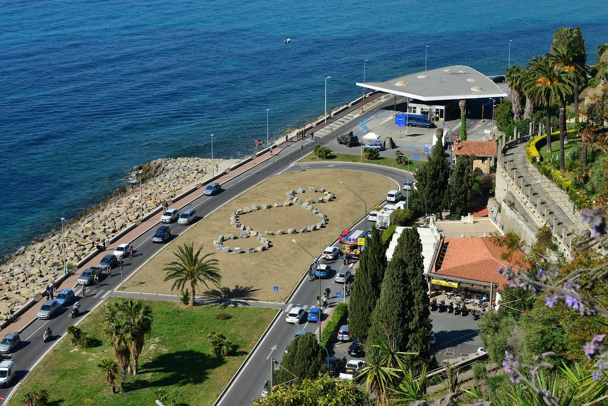 Mentone è abbastanza vicina a Bordighera: si trova infatti a pochissimi km da Ventimiglia ed è immediatamente a ridosso del confine francese. Per raggiungerla, in automobile o in moto, partendo dall’Hotel Rosalia si può tranquillamente percorrere la SS 1 Aurelia (che a Bordighera si chiama Via Vittorio Emanuele II) arrivando a Ventimiglia dove, superato il ponte sul fiume Roja, seguendo sempre le indicazioni per la SS 1, imboccate il lungo tunnel che passa sotto l’altura su cui sorge Ventimiglia Alta. Da qui procedete in direzione della piccola località di Latte (nel cui territorio ricadono i Giardini Hanbury) e andate oltre fino a che, dopo l’ultimo tunnel ricavato nell’alta falesia che ospita le Grotte dei Balzi Rossi, non arrivate al confine in località Ponte San Ludovico. Sul lato del mare, in una grossa aiuola ancora in territorio italiano, passate accanto a una grande opera d’arte di Michelangelo Pistoletto, “Il terzo paradiso“. Probabilmente non la noterete, perché è un’opera concepita per essere vista solo dall’alto: rappresenta l’infinito con un ulteriore cerchio nel mezzo, più grande, a significare la coesistenza degli opposti e la loro possibile interrelazione e comunicazione. Essendo posta su un confine, l’opera si pone come riflessione sul tema delle migrazioni (tema caldo e particolarmente tangibile da queste parti).