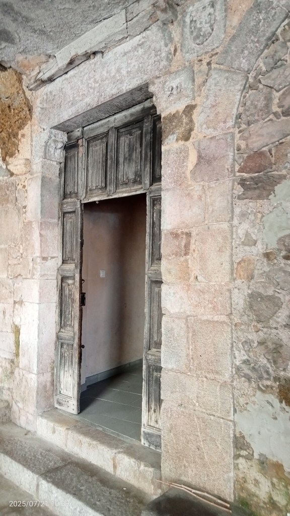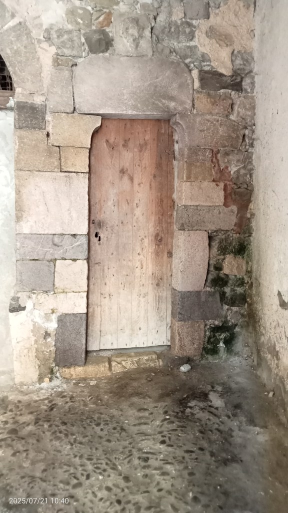 Un arco tondo ripara l’ingresso alla chiesa che è costituito da un portoncino semplice affiancato da due finestrelle a feritoia… All’ombra potrete provare a guardare i tesori contenuti all’interno della chiesa, che purtroppo viene aperta solo in specifici giorni dell’anno.