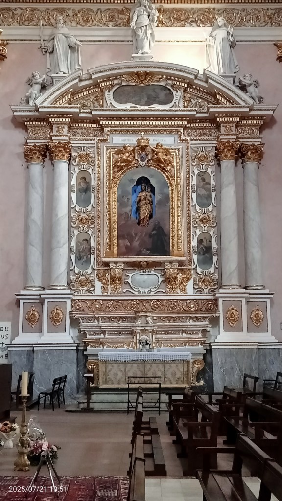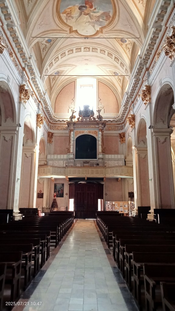 L’interno della chiesa è magniloquente ed arioso con tinte dominanti in rosa e oro. Elegante e leggera è la zona presbiteriale con altare maggiore ed un coro profondo.