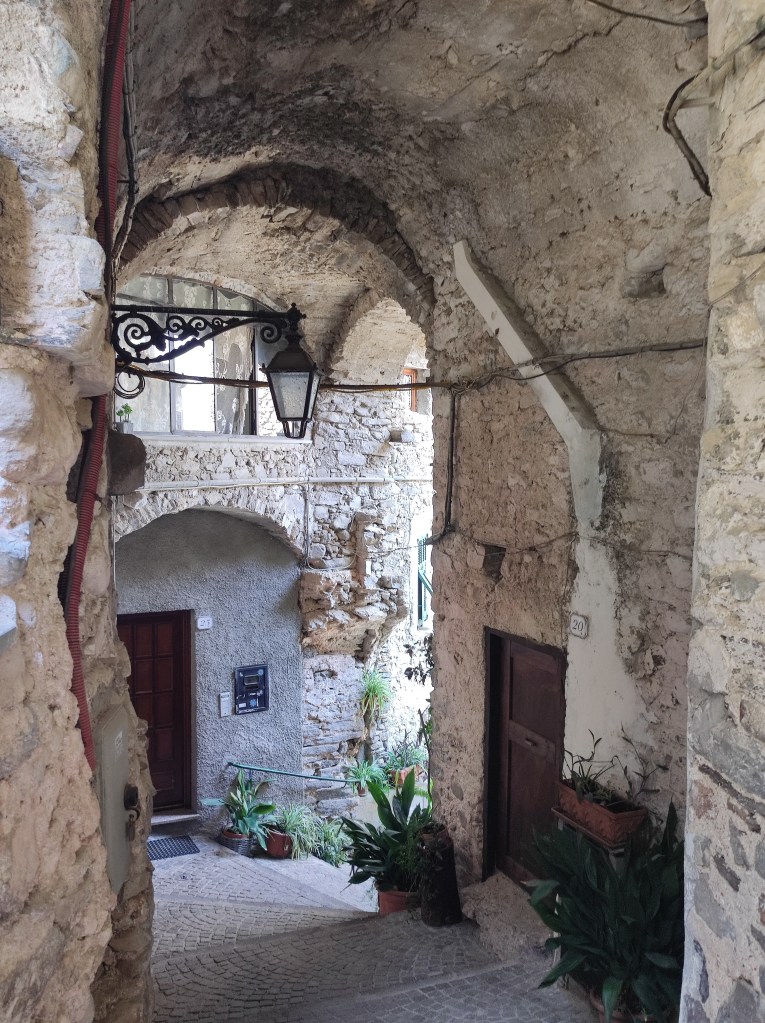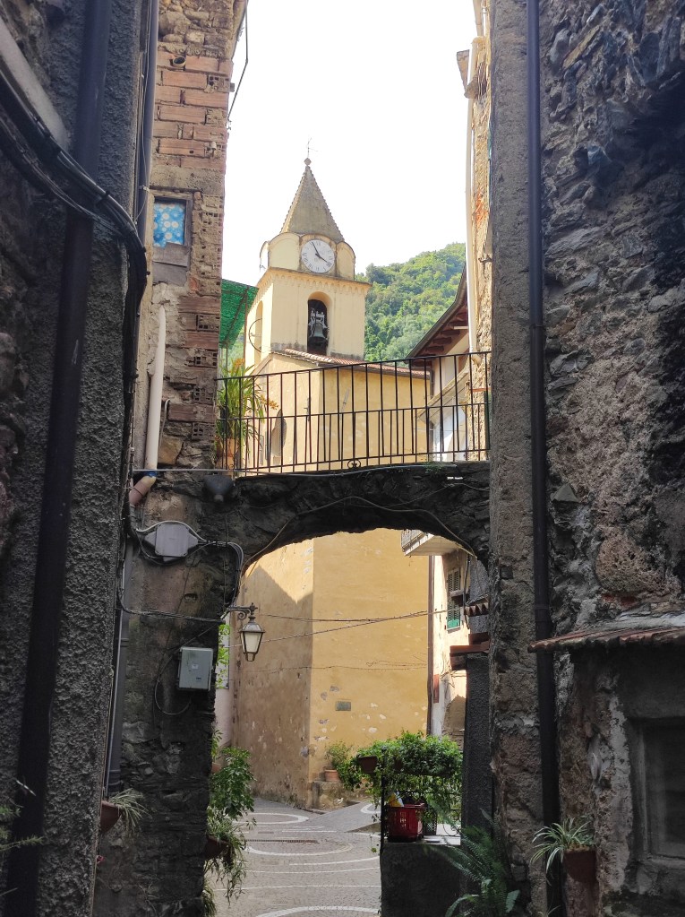 Dopo un altro paio di archivolti questa porzione del paese pare terminare: a sinistra un carugio vi condurrà ad un percorso liminare che salirà verso la propaggine est del paese e poi da esso uscirà conducendovi nella campagna più aspra…e da li sulle montagne boscose. A destra, una ampia piazzatta vi ricongiungerà al ponte carrabile sul Barbaira ed alla passeggiata pensile che abbiamo descritto poco fa.