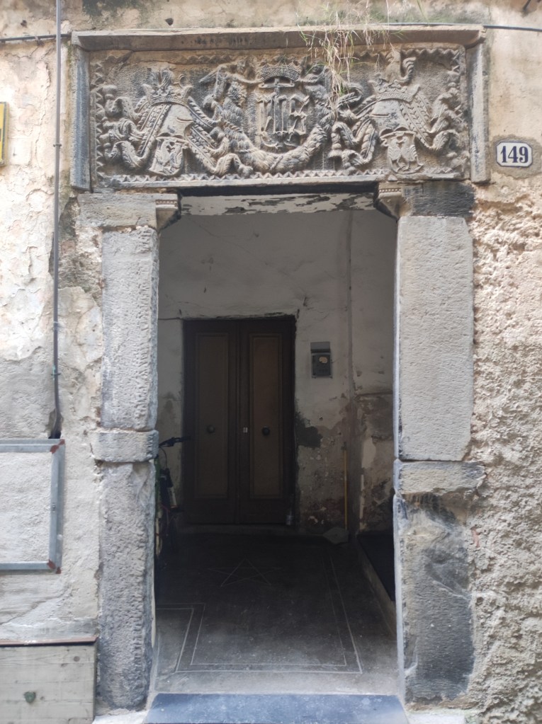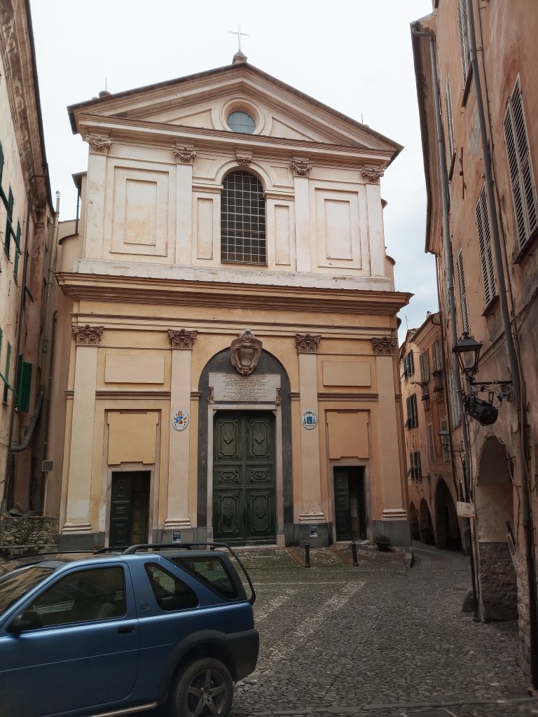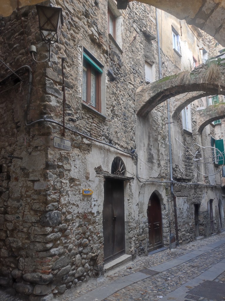 Scendiamo dal Castello ed addentriamoci di nuovo nel borgo costeggiando la chiesa di Santa Lucia. Incontriamo Porta Sottana che ci conduce in Via di Santa Lucia e poi fino alle Case Torri, dove scesi una ventina di metri di nuovo in direzione della Basilica, svolteremo a sinistra in Via San Dalmazzo, tra botteghe antiche e portali medievali in ardesia con rilievi di pregio con stemmi di famiglie abrasi o meno.
