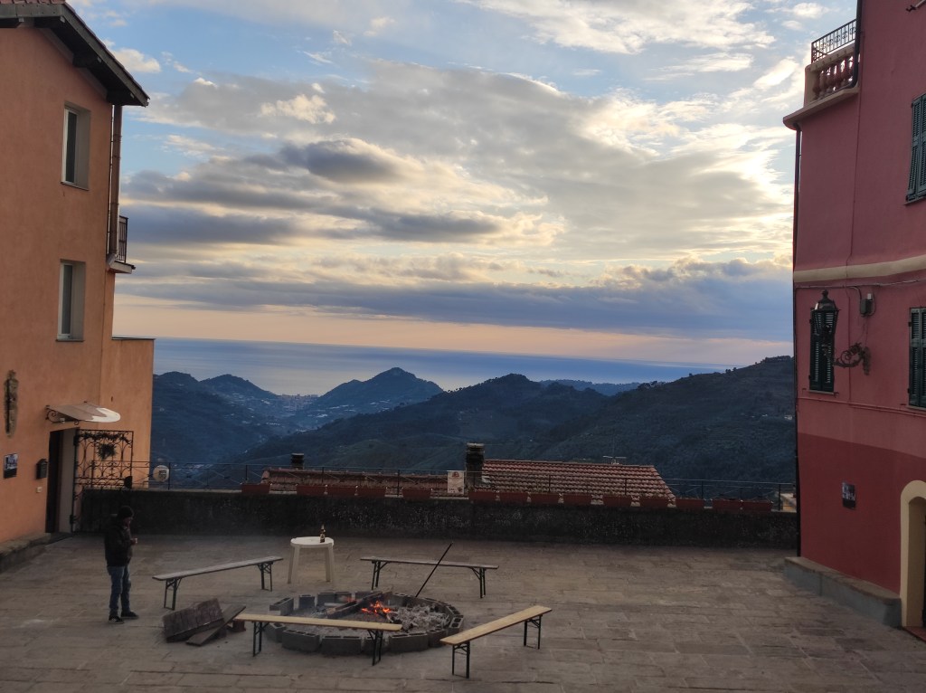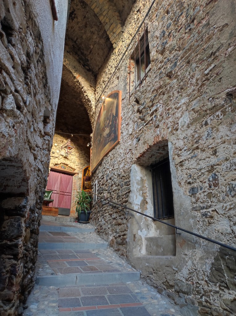 I dipinti poi lasceranno spazio a passaggi, scalinate, curiosi angolini con porte di case ben curate… Una di queste scalinate vi guiderà in uno dei punti più alti del paese dove si apre una terrazza panoramica orientata a nord. Da qui si può ammirare la catena delle Alpi marittime che incorona queste valli liguri e, più vicine, le montagne che circondano le nostre immediate vicinanze ed i borghi di Apricale, e Bajardo. Una vista splendida, tra boschi, borghi e casupole quasi irraggiungibili perse nel verde.