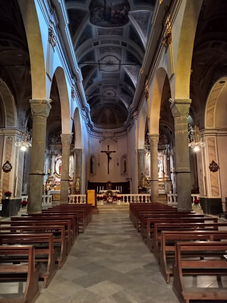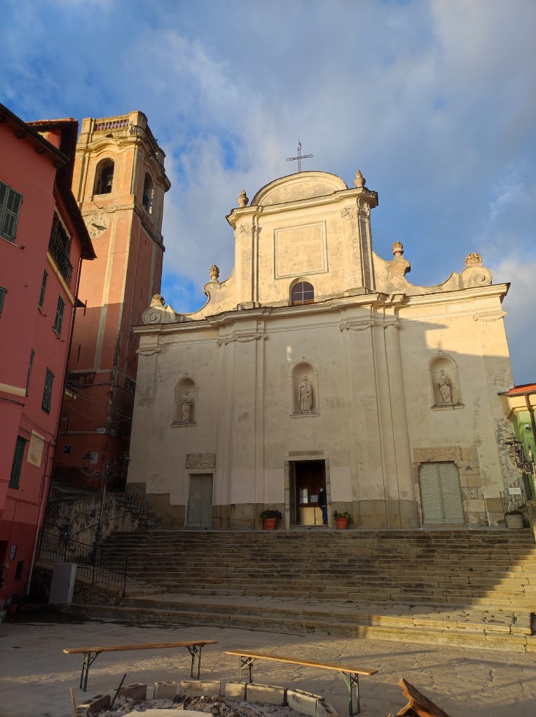 Da Piazza Castello si scende in un attimo alla Piazza vecchia su cui, oltre al carinissimo palazzo del Municipio, si affaccia la Chiesa Parrocchiale di San Nicola di Bari. Questo edificio religioso sorge su uno preesistente di origine medievale (XI secolo) indagato negli anni Sessanta da Nino Lamboglia (padre dell’Archeologia ligure), di cui restano alcune tracce sotto al piano pavimentale.