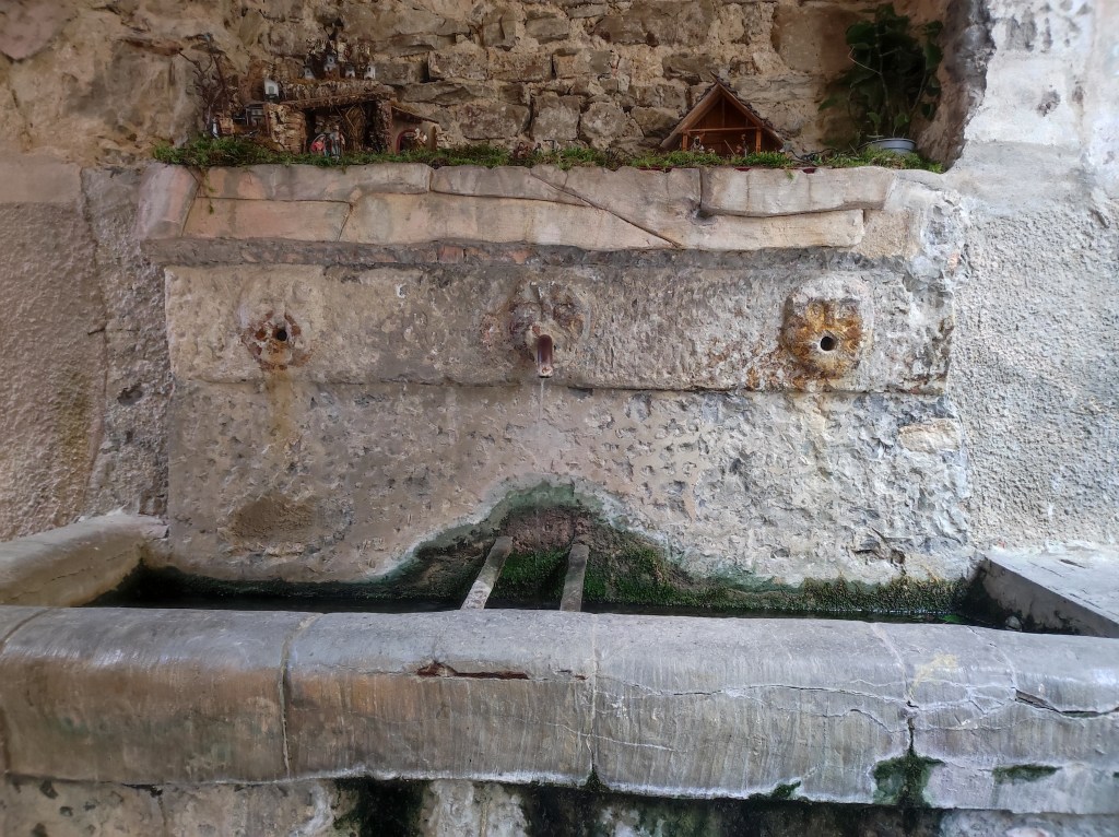 Proseguite. Passato un archivolto gradonato vi ricongiungerete con la via che dalla Piazza vecchia non avete scelto. Siamo sulla direttrice principale del paese, che congiunge la parte più antica con quella più estrema e nuova, sorta nei dintorni dell’attuale osservatorio. La via è un dolce saliscendi, alla cui metà si trova un crocicchio con due fontanili antichissimi decorati da teste di leone consumatissime. Lungo il percorso potrete vedere tantissime fotografie storiche che tratteggiano in maniera interessante la vita del paese dalla fine del XIX secolo fino ai primi decenni del Novecento. Visi, abbigliamento, usanze e vite che paiono, oggi, lontanissimi.