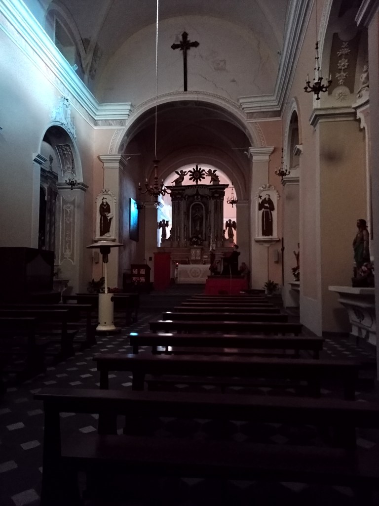 Tra angolini, piazzette e portoncini delizioni si giunge al pianoro rialzato dove sorge la Chiesa di Sant’Antonio da Padova, fondata nel XVII secolo. La chiesa ha una facciata a capanna molto semplice, divisa in due ordini e intonacata in rosa e arancio. In trompe l’oeil è decorata con elementi architettonici e nicchie con santi.