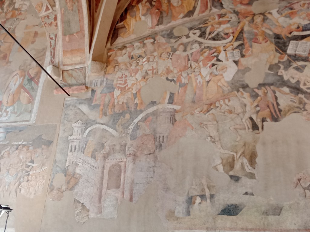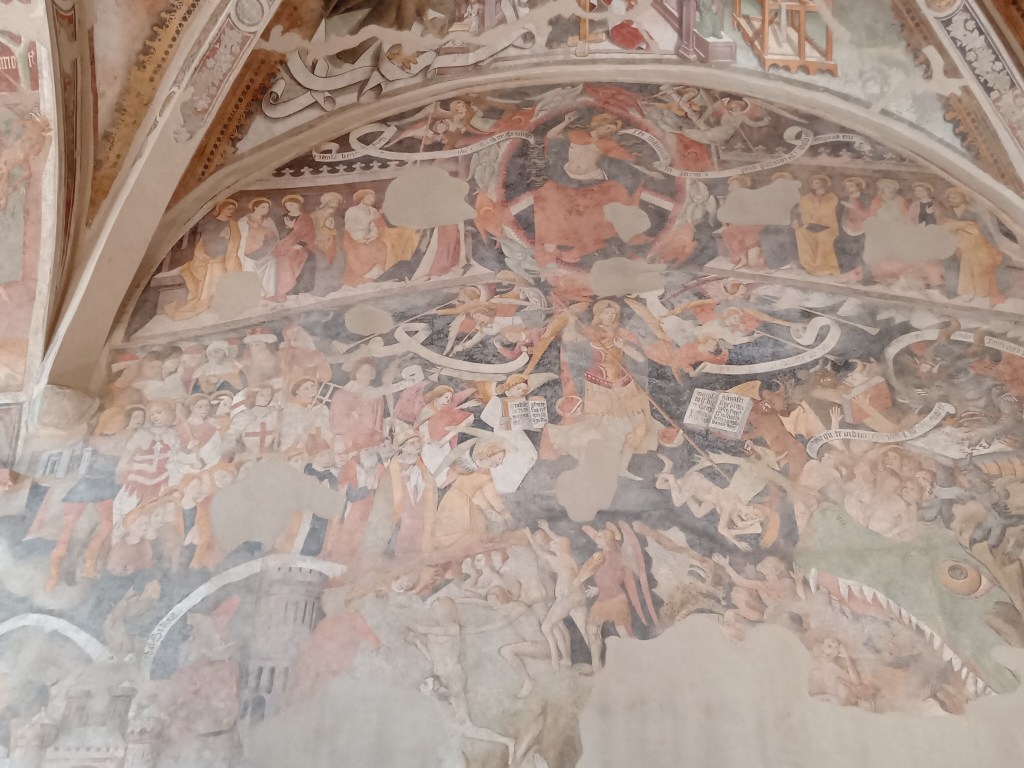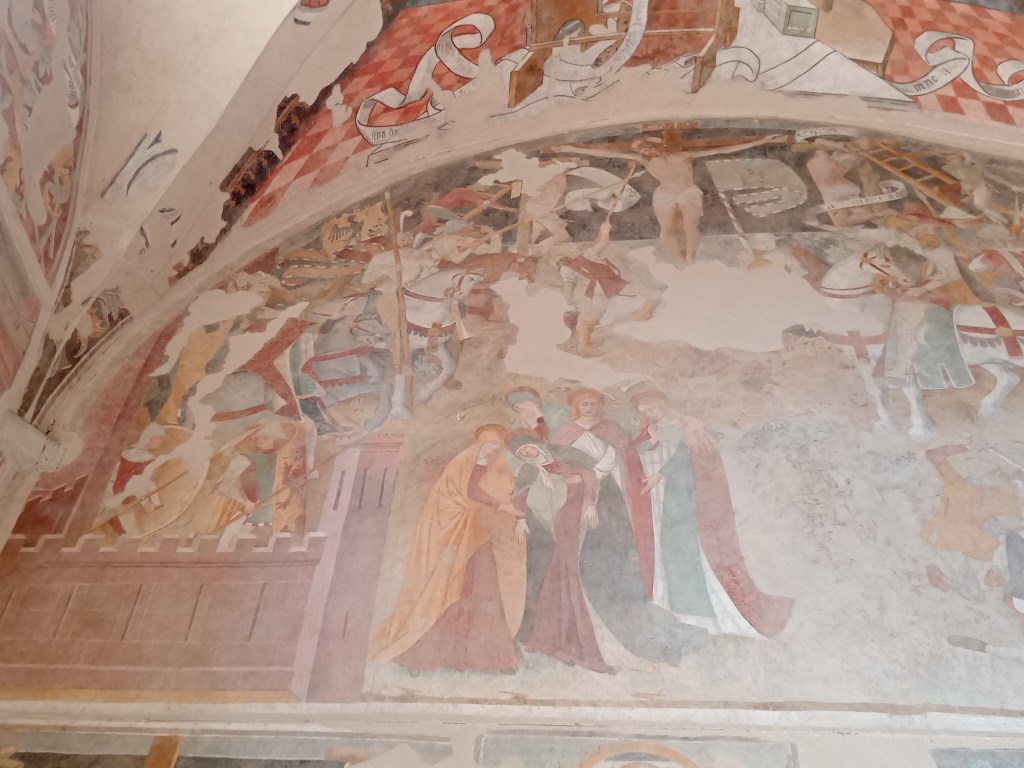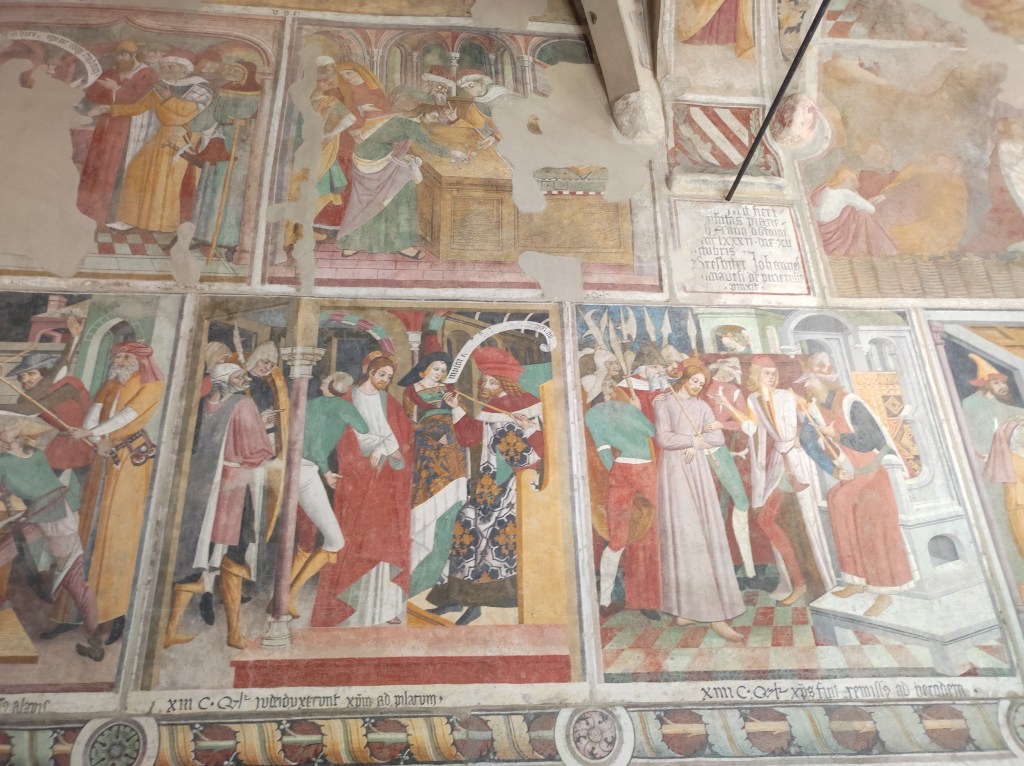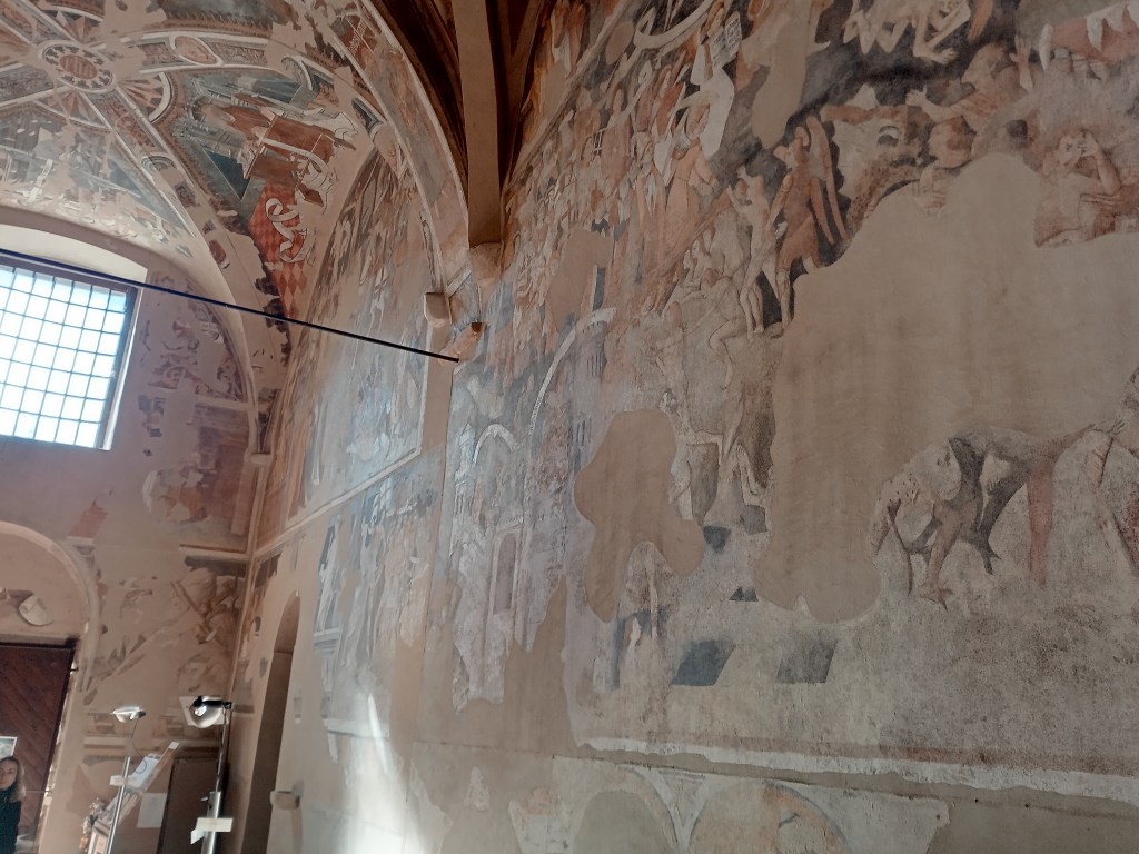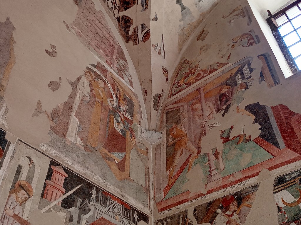 Una piccola curiosità: se provate ad osservare la superficie degli affreschi a luce radente, vedrete che essa (ad altezza sguardo) è costellata di graffiti e firme di visitatori che dalla consacrazione della chiesa nel 1482 hanno visitato questo luogo… Vedrete nomi in latino, disegni, stemmi, e piccoli cartigli che raccontano anche di storie lontanissime…