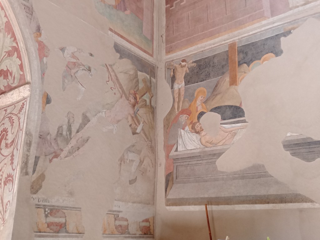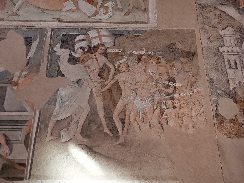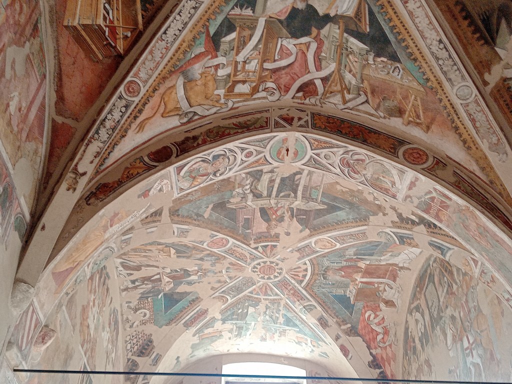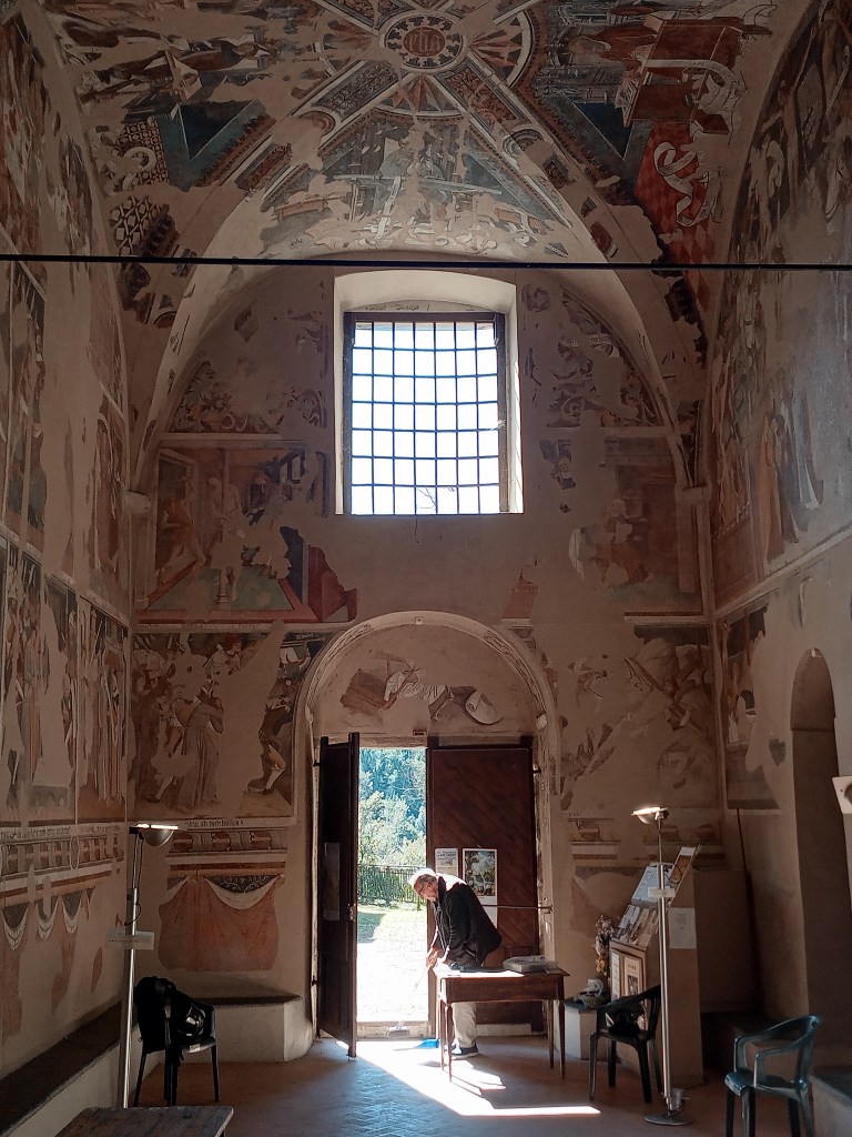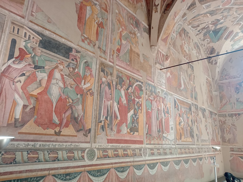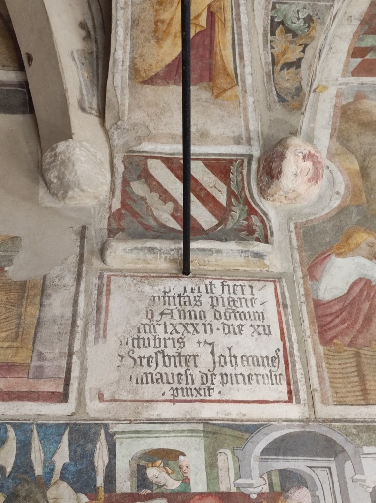 Una piccola curiosità: se provate ad osservare la superficie degli affreschi a luce radente, vedrete che essa (ad altezza sguardo) è costellata di graffiti e firme di visitatori che dalla consacrazione della chiesa nel 1482 hanno visitato questo luogo… Vedrete nomi in latino, disegni, stemmi, e piccoli cartigli che raccontano anche di storie lontanissime…