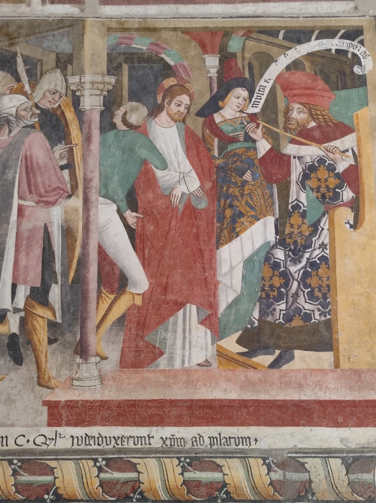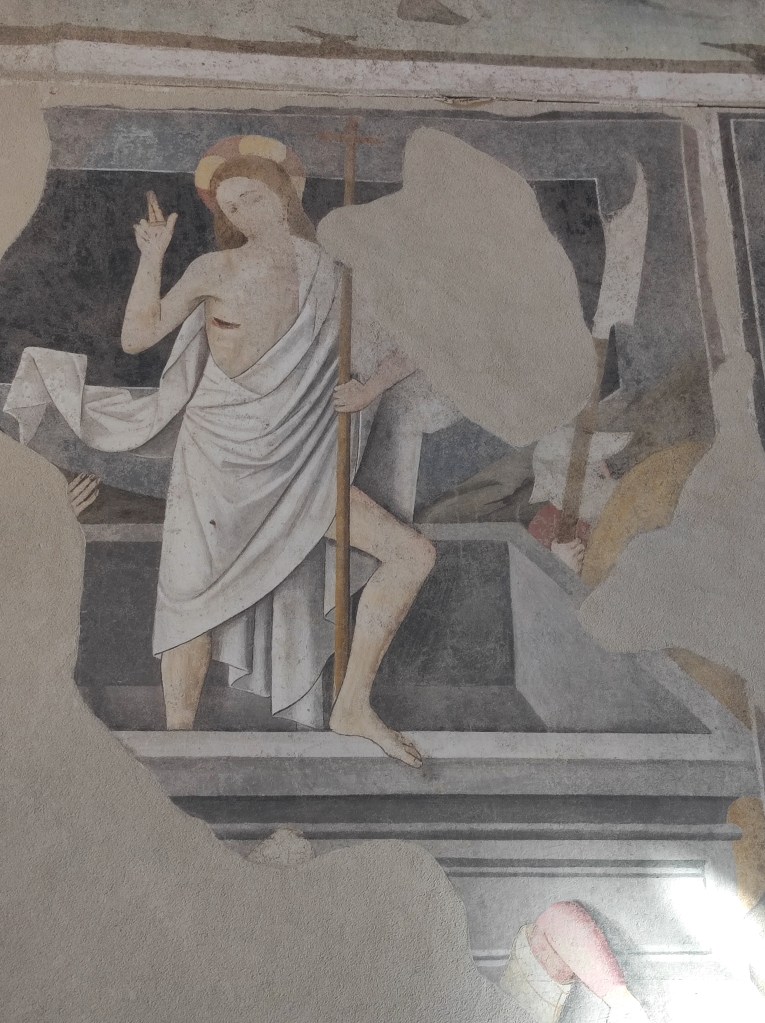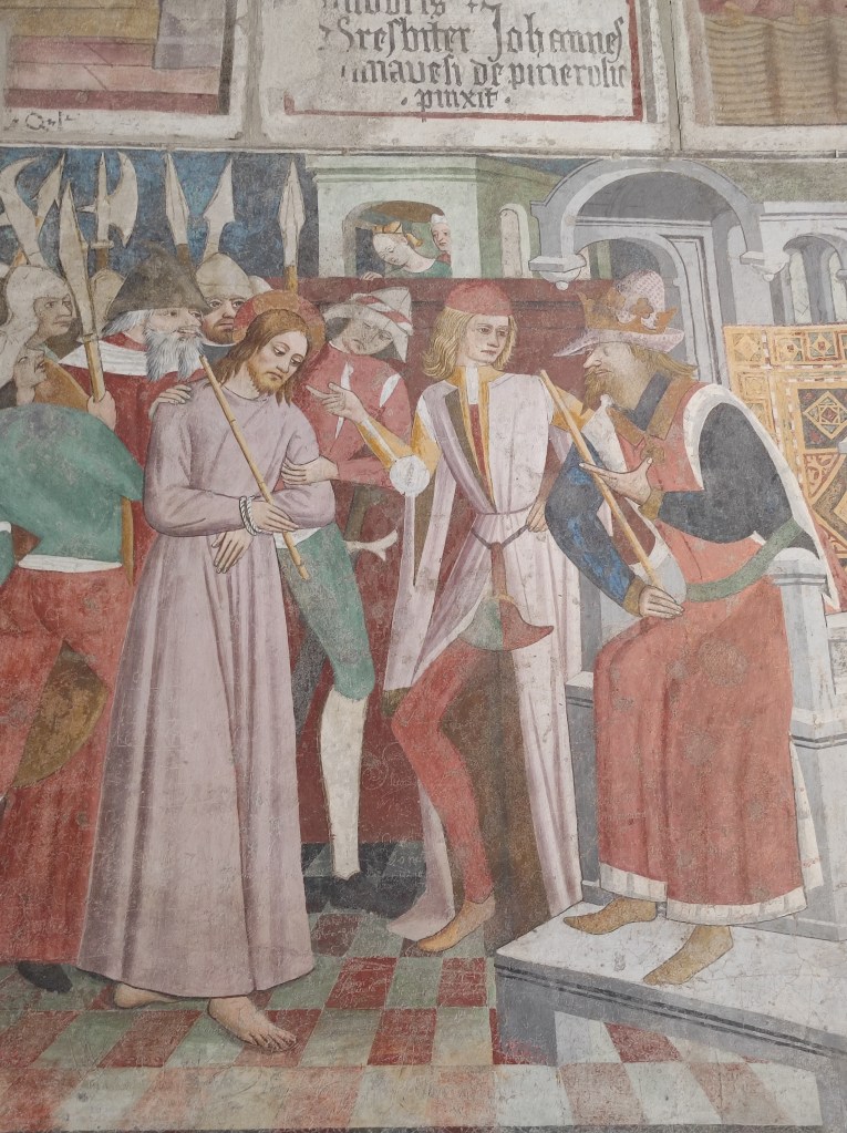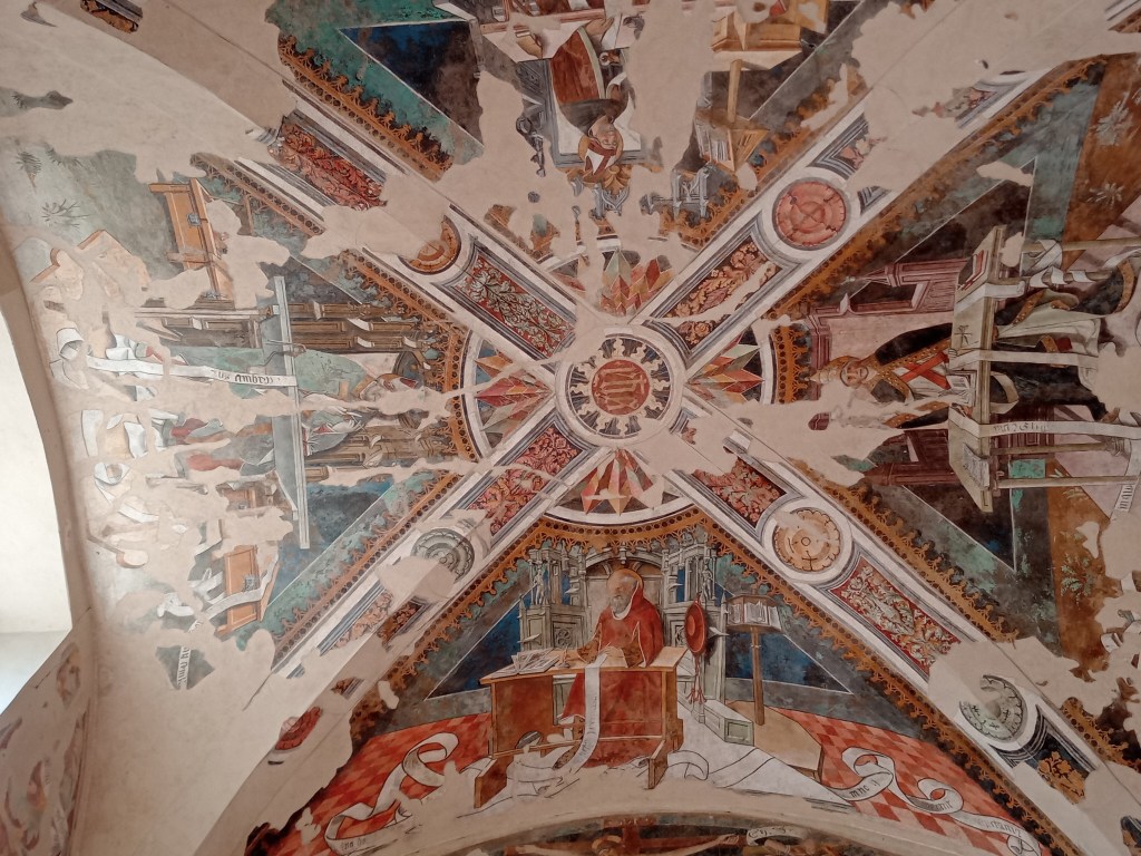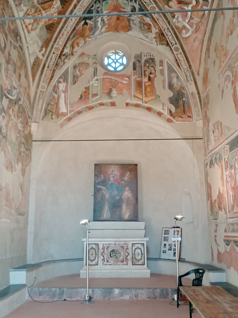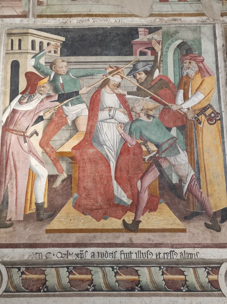 Una piccola curiosità: se provate ad osservare la superficie degli affreschi a luce radente, vedrete che essa (ad altezza sguardo) è costellata di graffiti e firme di visitatori che dalla consacrazione della chiesa nel 1482 hanno visitato questo luogo… Vedrete nomi in latino, disegni, stemmi, e piccoli cartigli che raccontano anche di storie lontanissime…