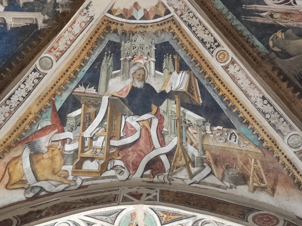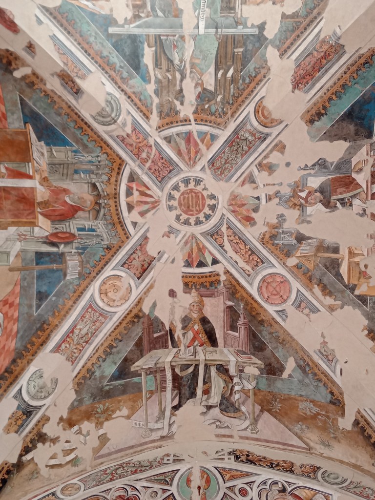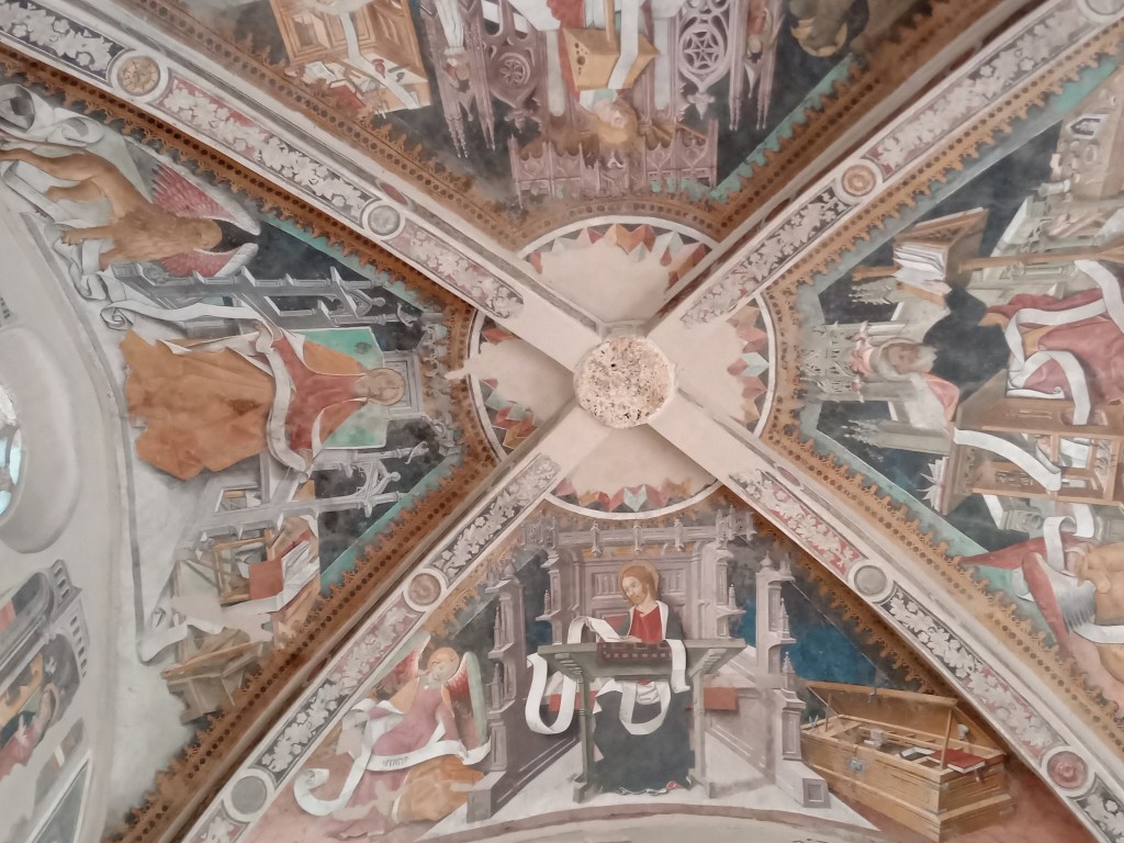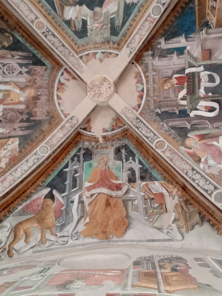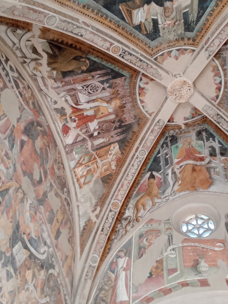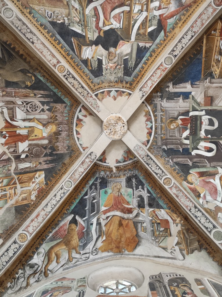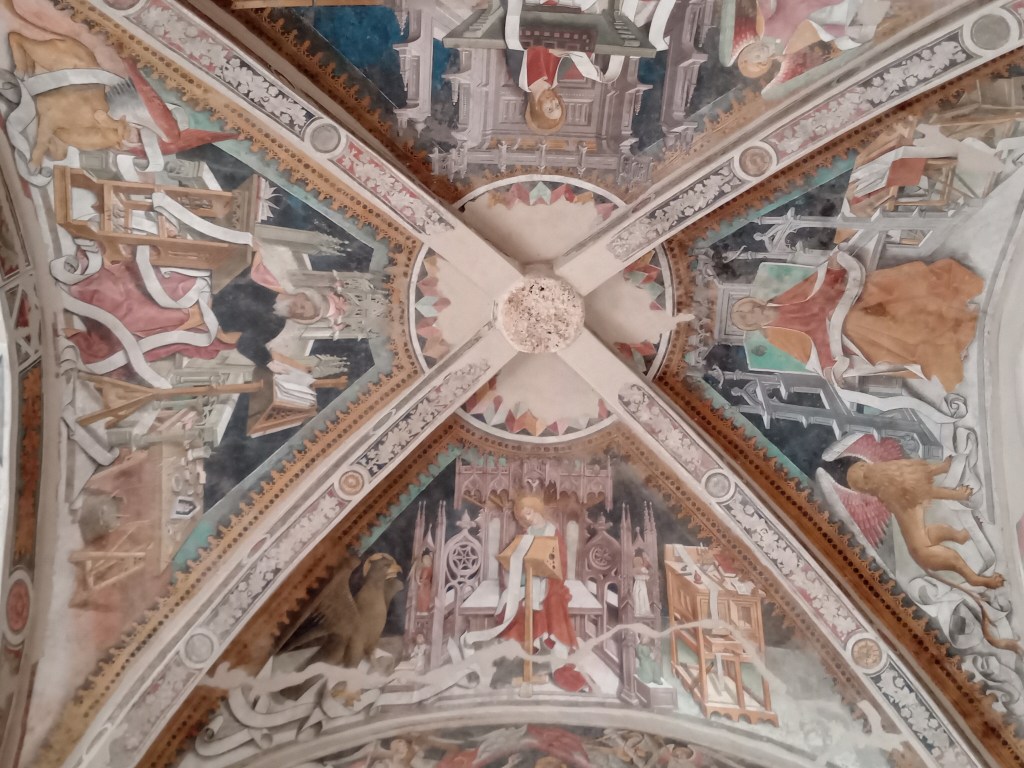 Le unghie delle volte a crociera sono decorate, molto probabilmente contestualmente dal Baleison (si nota una diversa attenzione ai particolari, ai volumi, differenti sono i visi ed i contorni delle figure) che le rende con colori molto più nitidi (o che hanno saputo resistere meglio al tempo?) e raffigurano i Quattro Evangelisti con i loro attributi (nella volta più prossima all’altare) ed i massimi Dottori della Chiesa (Sant’Agostino, San Girolamo, Sant’Ambrogio e San Gregorio Magno).