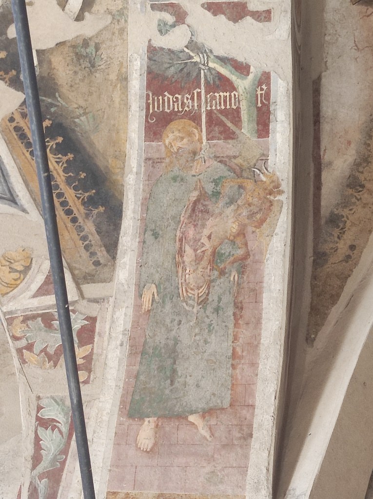 L’arcone tra le volte contiene i ritratti del Profeta Isaia, quello della Sibilla Cumana, quello del Re David, ed il drammatico Suicidio di Giuda, che il Canavesio riprenderà con ancora maggio effetto orrorifico a La Brigue un decennio dopo.
