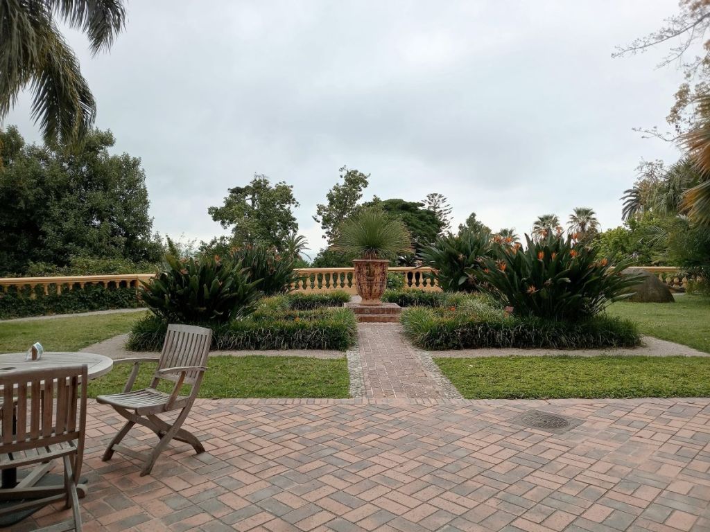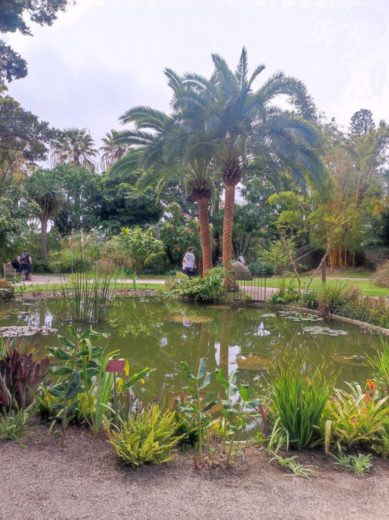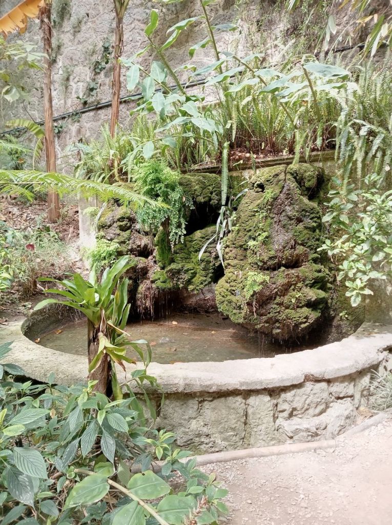 Quasi al termine del percorso, nuovamente giungiamo in un’area che abbandona l’aspetto “spontaneo” da foresta per riportarci nel mondo del giardino pianificato, ordinato e costruito: una bella terrazza affacciata sul mare (o meglio, prima che la città moderna ci si piazzasse davanti era effettivamente tale) circondata da alberi ad alto fusto e con un’ampia vasca nel mezzo, dove vivono piante di ninfea gigante che nella stagione della fioritura devono regalare uno spettacolo magnifico. Ora si vedono solo (si fa per dire) le grandissime foglie che possono raggiungere i 2 metri di diametro. In questo spazio ci sono delle panchine: un momento di ristoro e di riposo dopo il saliscendi immersi nelle piante esotiche.