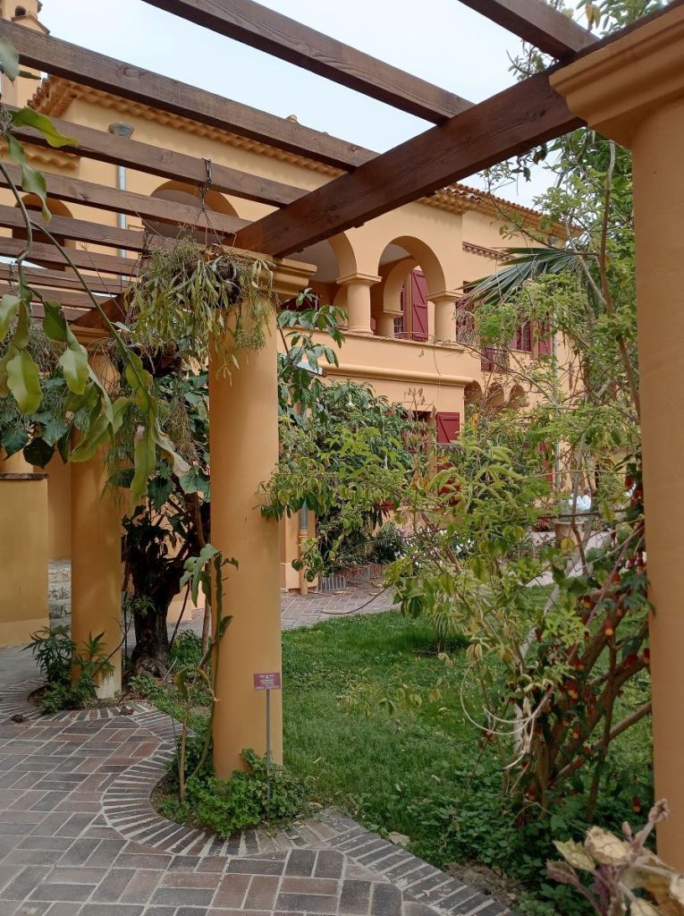 Per prima cosa si esce sul giardino antistante la bella villa realizzata nel primo ventennio del Novecento. Oggi il suo caldo colore ocra gialla ci fa immergere in quelle atmosfere mediterranee che sicuramente Rahmeh amava tanto. Il giardino davanti alla villa è elegante, le piante da fiore sono curate, da aiuola. Niente che faccia presagire ciò che vedremo dopo.